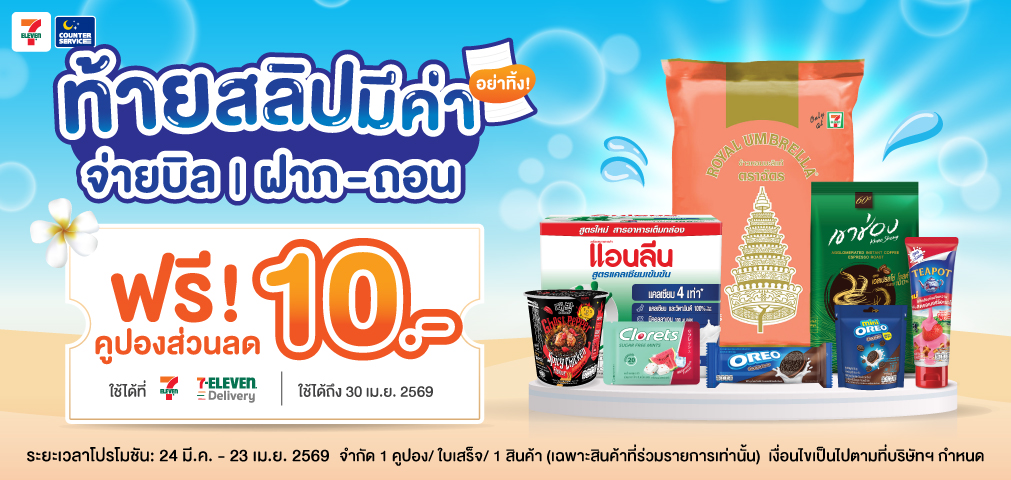 1. เมื่อใช้บริการ จ่ายบิล | ฝาก-ถอน ที่ร้านเซเว่น อีเลฟเว่น รับ คูปองส่วนลดสินค้า มูลค่า 10 บาท เพื่อใช้เป็นส่วนลดในครั้งต่อไป เมื่อซื้อสินค้าที่ร้านเซเว่นอีเลฟเว่นเฉพาะสินค้าที่ร่วมรายการ ได้แก่ ฉัตรข้าวหอมมะลิแท้ (ถุงสีโอรส) 2 กก. , เขาช่องกาแฟสำเร็จรูปเอสเปรสโซ่โรสต์ 45 กรัม , ทีพอทนมข้นหวานสตรอเบอร์รีโยเกิร์ตหลอดบีบ 150 กรัม , แดบัคคัพ โกสเป็ปเปอร์เส้นดําแห้ง รสไก่เผ็ด 79 กรัม , คลอเร็ทลูกอม 15.4 ก. (ทุกรสชาติ) *แบบแพ็กไม่ร่วมรายการ* , โอรีโอมินิแซนวิชคุกกี58.4ก.(ทุกรสชาติ) , โอรีโอแซนวิชคุกกี105,110.4ก.(เฉพาะรสวานิลลา,ช็อกโกแลต),ริทซ์แครกเกอร์รสชีส118ก. , แอนลีน สูตรเข้มข้น นม UHT 125 มล. (ทุกรสชาติ) 1 แพ็ก
