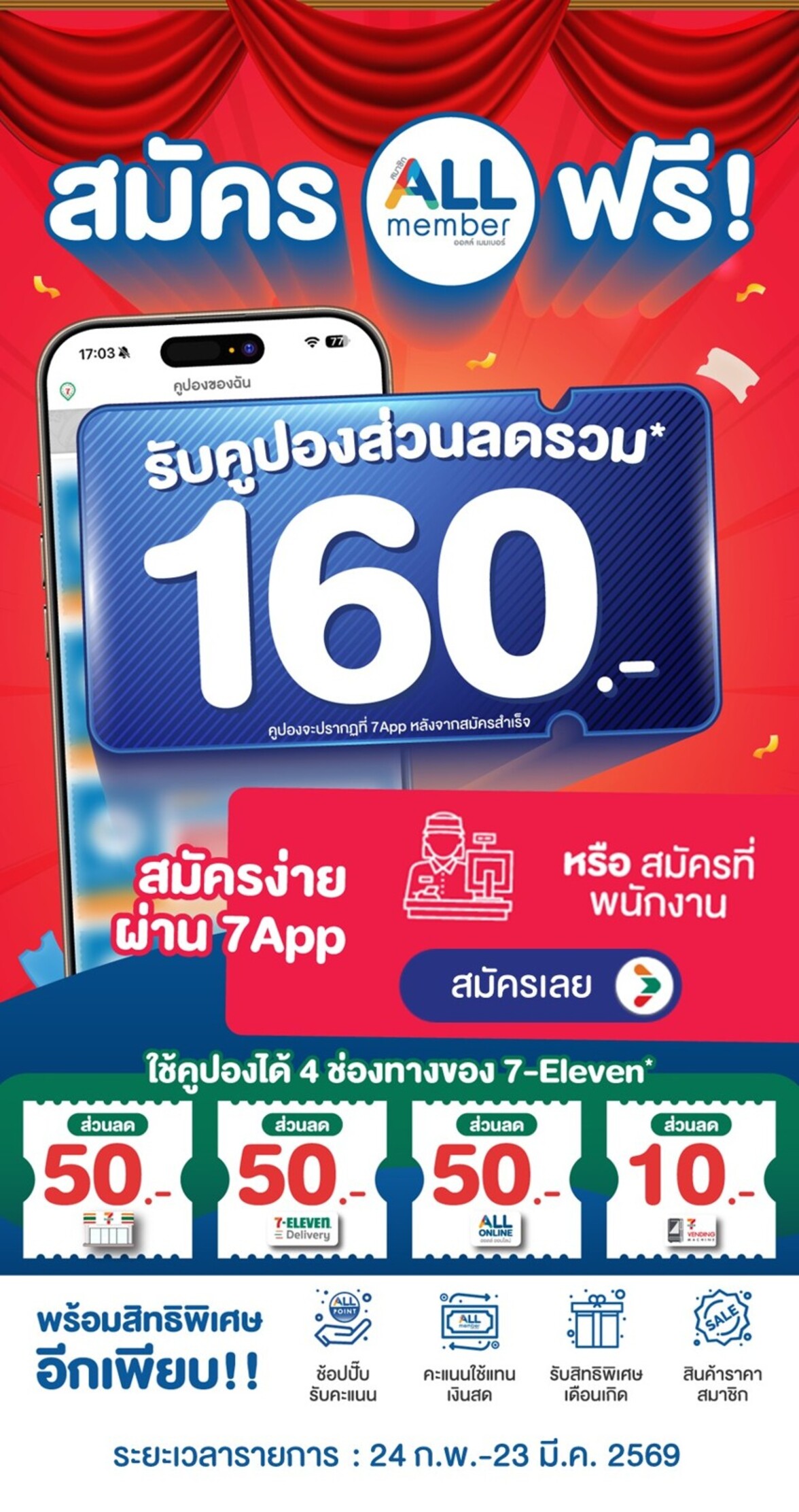 1. สมาชิกใหม่ ALL member สมัครสำเร็จ รับทันที คูปองส่วนลด 4 ช่องทางของ 7-Eleven ได้แก่ คูปองส่วนลดเฉพาะหน้าร้านสาขา 50 บาท (เมื่อซื้อสินค้าขั้นต่ำ 150 บาท*) ,คูปองส่วนลด 7Delivery 50.- บาท (เมื่อซื้อสินค้าขั้นต่ำ 200 บาท*), คูปองส่วนลด ALL ONLINE 50 บาท (เมื่อซื้อสินค้าขั้นต่ำ 400 บาท*), คูปองส่วนลดตู้เวนดิ้ง 10.- บาท (เมื่อซื้อสินค้าขั้นต่ำ 20 บาท*)