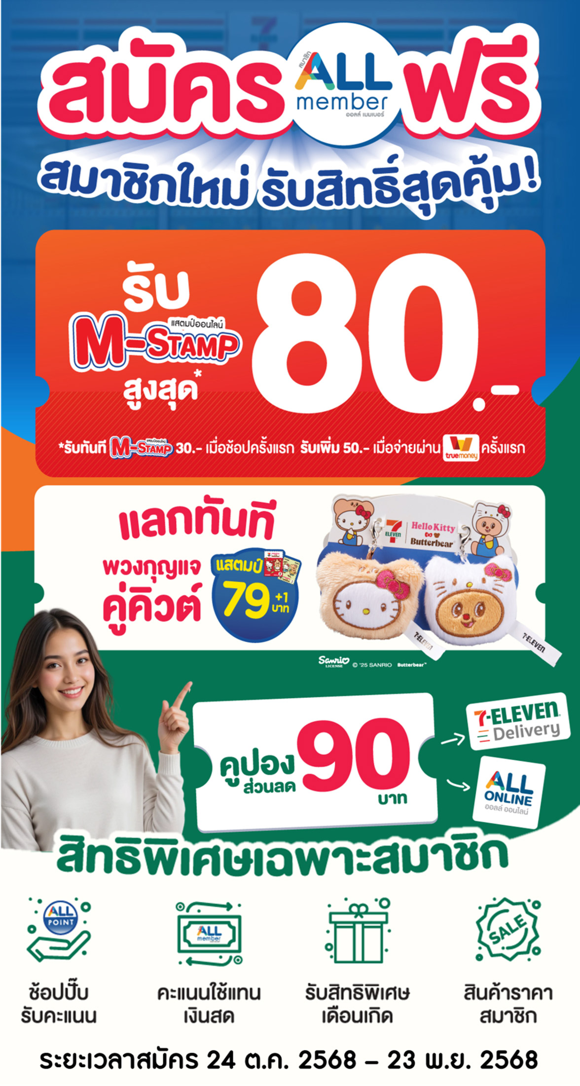 3. ระยะเวลาจัดรายการสำหรับผู้สมัครสมาชิก ALL member ตั้งแต่วันที่ 24 ต.ค. – 23 พ.ย. 2568 จะต้องทำตามเงื่อนไขที่กำหนดไว้ข่างต้นจึงจะได้รับสิทธิพิเศษตามที่กำหนด