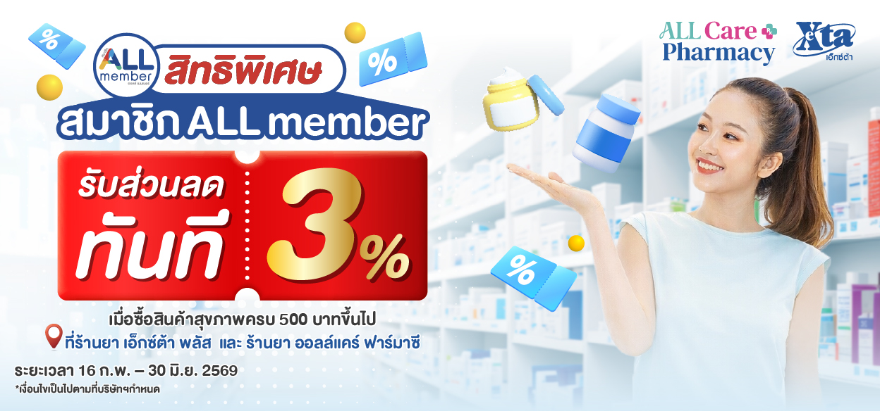 • เฉพาะสมาชิก ALL member เท่านั้น จึงจะได้รับส่วนลดแทนเงินสด 3% เมื่อซื้อสินค้าสุขภาพครบ 500 บาทขึ้นไป/ใบเสร็จ